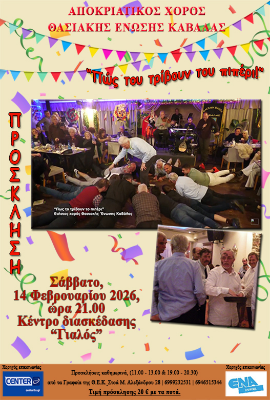 (Δημοτική Βιβλιοθήκη Καβάλας “Βασίλης Βασιλικός”, Τετάρτη, 11 Φεβρουαρίου 2026). - Αποκριάτικος χορός στην αίθουσα εκδηλώσεων του εστιατορίου «Γιαλός» στη Ραψάνη