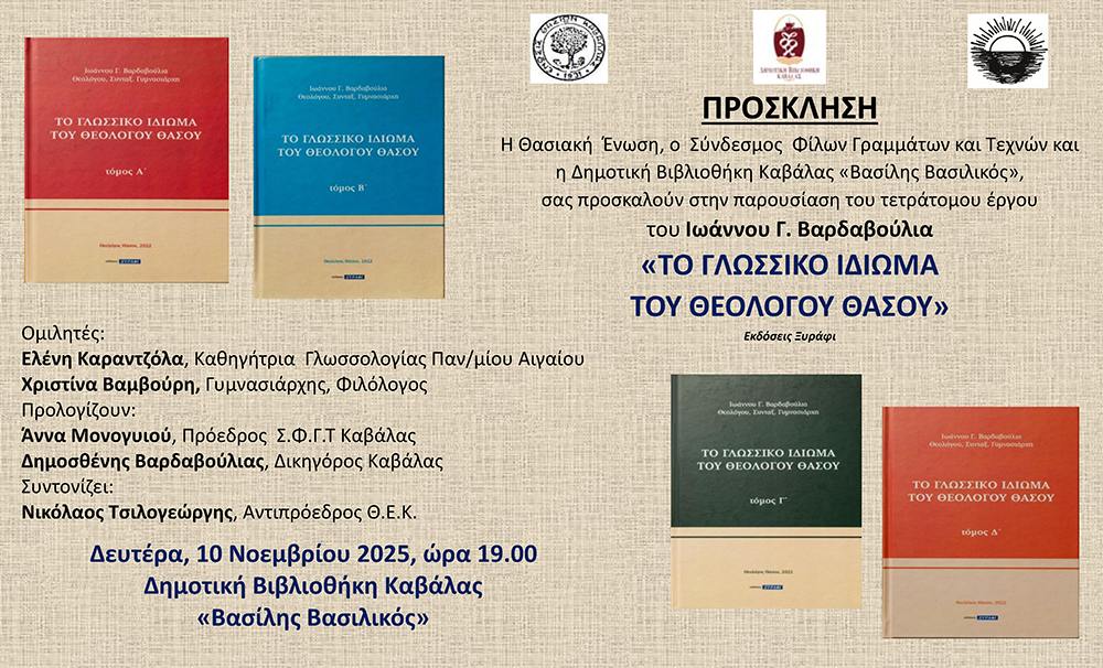 (Κυριακή, 9 Νοεμβρίου, 2025, ώρα 18.00, Καλογερικό). - Παρουσίαση του τετράτομου έργου του Ιωάννη Γ. Βαρδαβούλια “To γλωσσικό ιδίωμα του Θεολόγου Θάσου”.