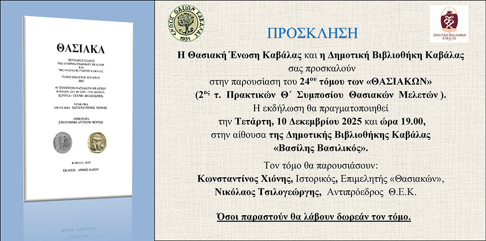 - Παρουσίαση του 24ου τόμου των «Θασιακών» ( Πρακτικά, (2ος τ.), Θ΄ Συμποσίου Θασιακών Μελετών) σε συνεργασία με τη Δημοτική Βιβλιοθήκη Καβάλας «Βασίλης Βασιλικός» (Τετάρτη, 10 Δεκεμβρίου 2025, ώρα 19.00)